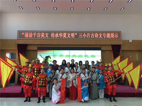 12月28日下午,昌平区实验三小片举行了“诵读千古美文,传承华夏文明”古诗文专题展示活动,参加活动的学校有:北师大未来科技城学校、清华附小昌平学校、北七家中心小学、崔村中心小学、兴寿中心小学、上苑中心小学、大东流中心小学、昌平第三实验小学共8所学校,参赛选手近160人。学生们通过各种形式展现,多种学科的整合,从诗经到乐府,再到唐诗宋词,他们展现中华的大好河山,表达诗人的忧国忧民,以及报国浩气。将中华古典文化之瑰宝展现的淋漓尽致,气势宏大,让人震撼。孩子们也在活动中深受传统文化的教育,有效提升了学生的文化素养。活动结束后评选出一等奖、二等奖各四名,各校领导为学生发奖。最后进修学校高春杰老师为大家做了总结,并对同学们提出殷切的希望:将中华经典诗文发扬光大!