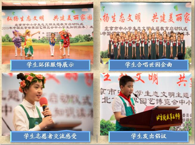 启动仪式上,市教委基教一处魏旭斌处长就《北京市中小学生态文明宣传教育实施方案》作了说明和工作部署,与会领导共同启动了生态文明主题教育活动,并向各区学校代表赠送了《2019年中国北京世界园艺博览会中小学生知识读本》。延庆区第一中学介绍了学校生态文明教育开展情况。延庆区第三小学学生武泽鹏向全市中小学生发出倡议,号召同学们要爱护身边环境、养成文明习惯、节约珍惜资源、倡导绿色出行、争做文明使者。启动仪式前,延庆区第二小学同学们表演了世园金曲《绿色北京Green China》合唱,延庆区第七幼儿园小朋友们进行了生态环保服饰展示。启动仪式结束后,北京教科院可持续发展教育研究所王巧玲所长,作了生态文明教育专题讲座。