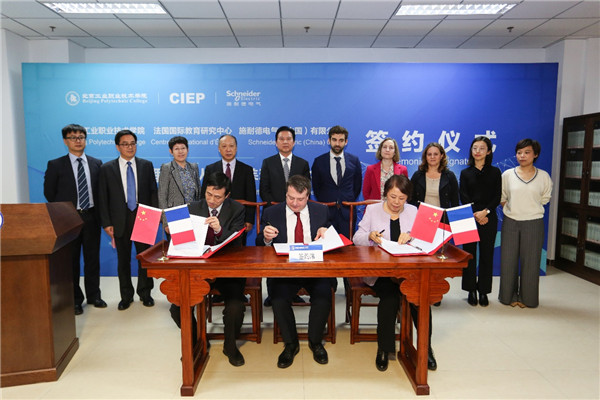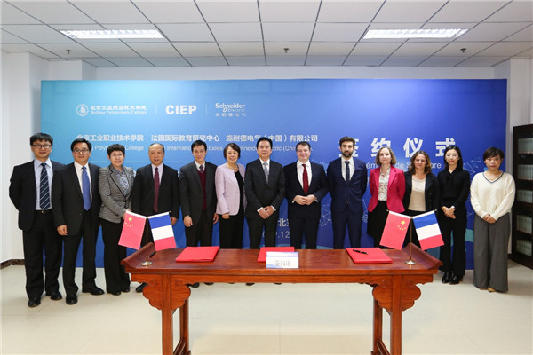 2019年12月5日,中法智慧城市能效管理应用人才培养和研究中心落户北京工业职业技术学院。市教委副主任黄侃、市教委职成处处长王东江、法国大使馆职业教育专员顾博等领导和嘉宾出席签约仪式。北京工业职业技术学院书记王伟、法国国际教育研究中心负责人皮埃尔-弗朗索瓦.穆尔、法国施耐德电气中国区副总裁王洁共同签署了合作意向。未来,该中心将被打造成为我市智慧城市建设领域的高级应用复合型人才培养高地。