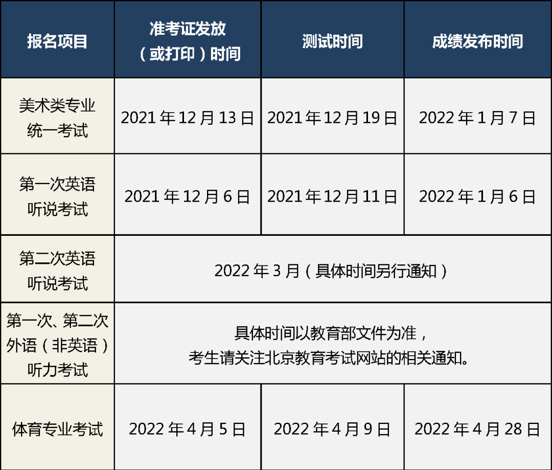 北京市2022年普通高等学校 招生相关测试安排