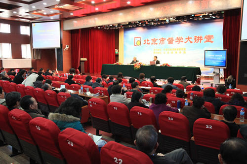 这是由北京市政府教育督导室与北京教育学院联合举办的“北京市督学大讲堂”第三次,也是2011年第一次开课。北京市、各区县的教育督导室主任、副主任,全体专、兼职督学,以及部分在北京教育学院参训的学员到大讲堂听课。