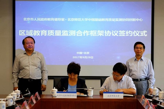 9月29日,北京市人民政府教育督导室与北京师范大学中国基础教育质量监测协同创新中心举行区域教育质量监测合作框架协议签约仪式。北京市委教育工委副书记、市政府教育督导室主任唐立军,北京师范大学校长、中国基础教育质量监测协同创新中心主任董奇,北京市教育委员会委员冯洪荣,北京市政府教育督导室副主任关国珍、冯义国,中国基础教育质量监测协同创新中心常务副主任辛涛等出席仪式。中国基础教育质量监测协同创新中心党总支书记任萍主持仪式。