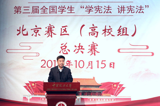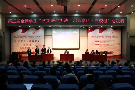 为全面深入贯彻落实党的十九大和十九届二中、三中全会精神,落实教育部等单位关于深入学习宣传和贯彻实施宪法相关要求,2018年10月15日,第三届全国学生“学宪法讲宪法”北京赛区(高校组)总决赛在中国政法大学成功举行。教育部政策法规司巡视员王家勤、中国政法大学党委书记胡明、副校长李树忠等单位领导与部分高校师生共计400余人一起观看了比赛。来自首都高校的法学教育、语言艺术等方面专家和政法一线工作者担任评委嘉宾。