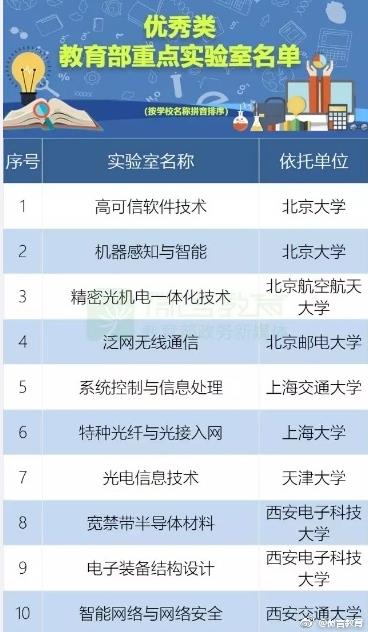 近日,教育部科技司公示了2017年度教育部重点实验室评估结果。根据初评、现场考察和综合评议的成绩,经研究,信息领域56个参评实验室中,共有10个实验室评估结果为优秀,41个实验室评估结果为良好,其余实验室未通过定期评估。具体名单可在教育部网站查询。