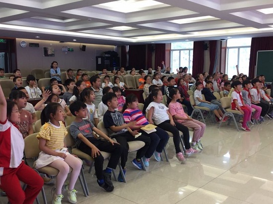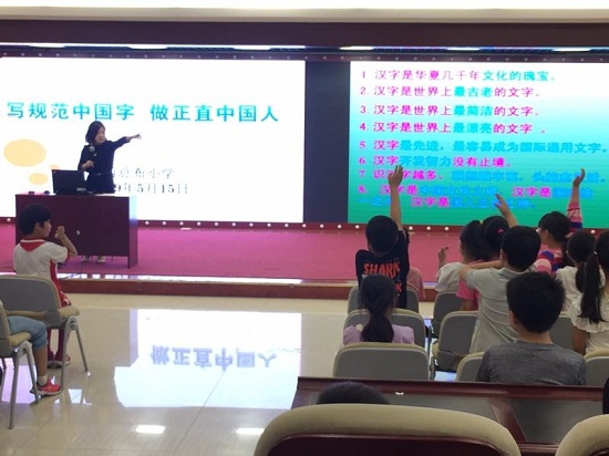 2019年5月15日下午,西总布小学三、五年级学生在礼堂开展“写规范中国字 做正直中国人”的活动,这是学校系列讲座活动的第二场。