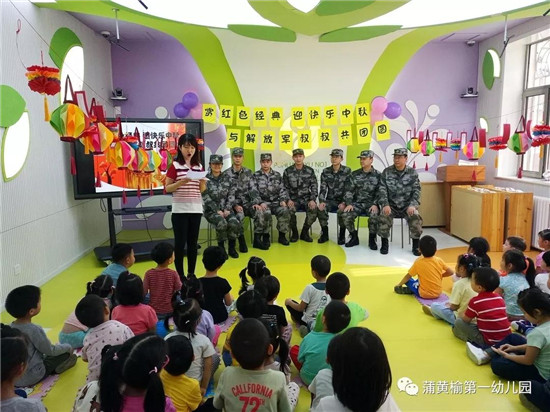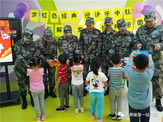 幼儿园利用家长资源,邀请在部队工作的家长到园与孩子们一起共度中秋;结合社区情况为社区内的爷爷奶奶们送祝福。