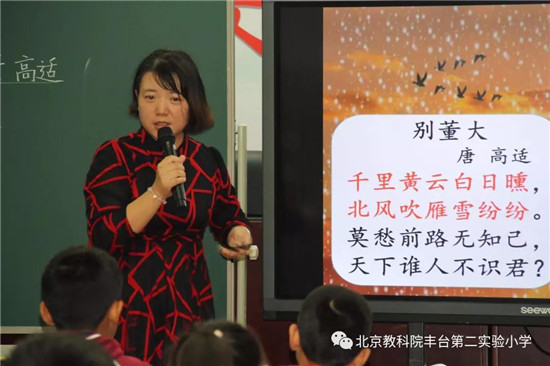 第二节课由大红门一小的代淋老师执教古诗《别董大》。代老师先带领学生流利、有节奏地朗读古诗,然后层次清楚地学习古诗:一、走入诗景:通过以诗配画的形式感受前两句古诗的伤感的景色。二、走入诗情:联系董大的身世,理解后两句诗人对董大的鼓励、劝慰之情。三、情与景的融合:联系高适的人生经历,了解诗人豁达、乐观的心态。再次回到古诗的景色的描写中,抓住 “白日曛”等词语看到伤感的景色中隐含着希望和美好的未来。进而理解眼中的景色暗含诗人的心情。三个环节循序渐进,引领学生入情入境地学习古诗,理解诗人的真正心声。