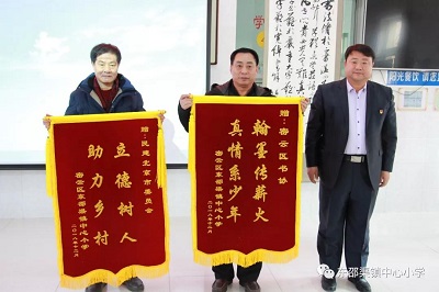 在我校的书法教育特色建设中,还有这样一群人,不断地给予我们帮助。民建丰台区副主委、丰台区书法家协会副主席聂军生教授每月都会到校免费为孩子们上两个小时的书法课,无论刮风下雨,严寒酷暑,从未间断过;密云区书协的各位书法家们更是不遗余力地经常到校为老师和学生进行指导。王少波校长代表学校向聂军生教授和密云书协任学增主席赠送锦旗以表达我们的谢意。