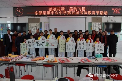 为了进一步弘扬中华优秀传统文化,立德树人,推进学校书法教育特色工作开展,落实教委“书法传承工程”,体现“继承、发展、创新”的工作思路,明确学校书法建设的路径,回顾学校三十多年的书法教育建设历程,增强学生民族自信、文化自信,激发学生对书法的热爱之情,展示师生特长,2018年12月14日东邵渠镇中心小学举办了“鹅池花满,墨韵飞扬”第五届书法教育节。