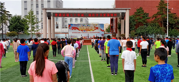 学校领导高度重视,组织安排合理有序。学校副校长赵静在全校大会上作推普周的专题讲话,对推普周活动进行了全面的宣传和布置。在校园中营造推普氛围,在校内张贴宣传推普周的主题的内容,“普通话诵七十华诞。规范字书爱国情怀”、“树立语言规范意识,构建和谐校园环境”、“ 说准普通话,写好规范字”、“用文明语,做文明人”等,在校园张贴醒目的宣传画,营造语言文字的环境,使整个校园处处包裹在推普周的氛围中,起到了很好的宣传、教育、熏染的效果。此外,学校广播站在推普周期间以“推普”为专题,浓厚推普周宣传氛围。各班出一个主题为“推普周”的宣传手抄报,激发了全校师生正确运用祖国语言文字的热情。