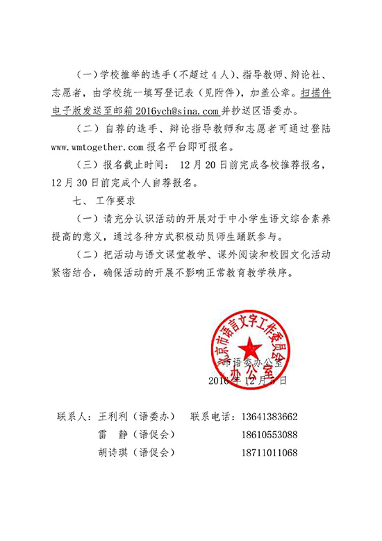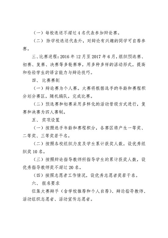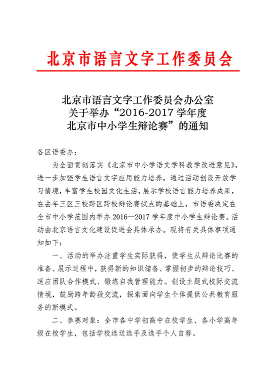 北京市语言文字工作委员会办公室 关于举办“2016-2017学年度北京市中小学生辩论赛”的通知
