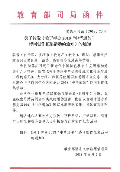 为贯彻落实习近平新时代中国特色社会主义思想和党的十九大精神,落实《关于实施中华优秀传统文化传承发展工程的意见》,大力推广和规范使用国家通用语言文字,同时配合以普通话语音系统为基础的“中华通韵”国家标准研究制定工作,探索总结诗词创作实践的用韵规律,教育部语言文字应用管理司联合中华诗词学会举办2018“中华通韵”诗词创作征集活动。现将有关事项通知如下: