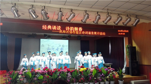 12月27日,昌平区巩华片协作组开展“经典诵读诗韵飘香”古诗词诵读展示活动。此次古诗词诵读活动共有七所学校,近百学生参加,他们精神抖擞、热情高涨,有的慷慨激昂,有的娓娓道来……他们用抑扬顿挫的语调、跌宕起伏的情节、真挚朴实的情感,声情并茂地阐述了自己对经典古诗词的理解。他们浑厚有力的诵读声带领我们走进古诗词,一起去感受那诗情画意,感受那豪情壮志!此次活动的开展,加强了学生的传统文化底蕴建设,激励学生不断去探索中华传统文化的奥秘,让中华经典代代相传! (刘大杰)