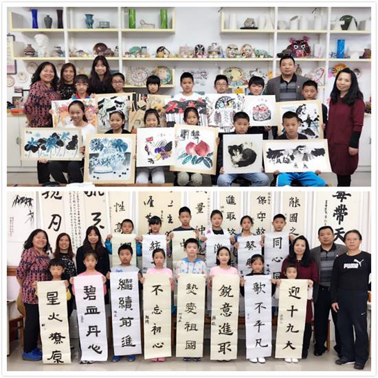 10月10日下午第二节课后,书画社团的学生高高兴兴走进了书法、美术教室。张金宝校长、左红霞副书记等党员干部、书画教师代表等一起参加了活动。在和学生的互动中,党员干部穿插讲解了党的光辉历程、榜样的力量。而后,学生用饱含激情的笔墨丹青抒发出自己对祖国、党和人民的热爱。书法社团的同学身正笔端,或隶或楷,尽情书写:“不忘初心、继续前进”、“中国特色、锐意进取”、“星火燎原、碧血丹心”,一幅幅书法作品表达出学生们对党和人民的热爱;美术社团的同学墨彩纷呈,或工或写,借画言志:壮丽的山川、鲜艳的花卉,鲜活的动物,一幅幅国画作品流露出学生们对党和家乡的深爱。最后大家合影留念,活动在祥和的气氛中圆满结束。