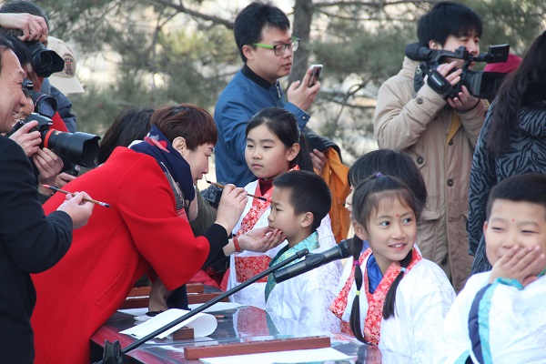 2月27日,农历二月初二,朝阳区高碑店中心小学的学生们参加了社区组织的“二月二童子开笔”礼,活动中,学生们正衣冠、祭拜孔子。朝阳区社区学院、高碑店乡和高碑店村的干部为刚刚入学的孩子们“朱砂启智”,在额头正中点上一颗“红痣”,寓意孩子们从此眼亮心明,好好读书。