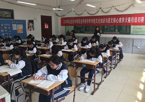 为配合北京市中华传统文化知识与语文核心素养大赛工作,同时更好地展现学校学生的精神面貌,提高学生的学习兴趣,4月8日,劲松职高常营校区进行了校内选拔赛。各校区语文备课组长担任本次预选赛评委工作,全校共有八十名学生参加了校内选拔。