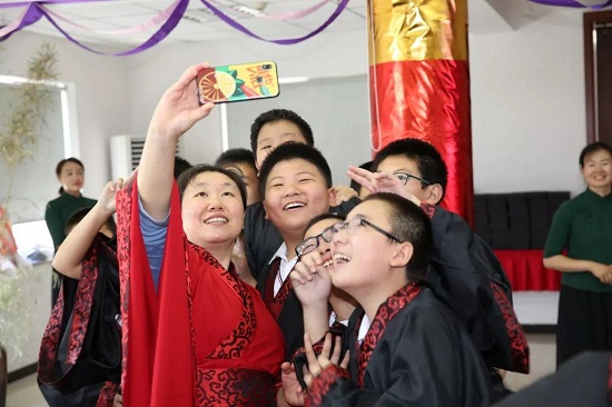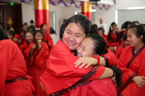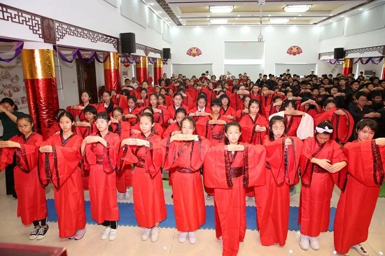 礼,知礼好学,感恩恭敬。德,厚德载物,辅正根基。身着华服的毕业生和老师们伴随着悠扬的歌声步入礼堂,毕业生们在主持人的带领下,向天地、先辈、恩师、父母、伙伴施以“感恩礼”“谢师礼”“孝亲礼”“悌友礼”“启志礼”。穿华服行华礼,通过学习传统文化的礼仪,升起中华民族的民族自豪感,重塑我华夏礼仪之邦的尊荣。今天的学习就是要在孩子心中扎下一颗传承的种子,传承古圣先贤的智慧,做忠孝两全、感恩恭敬、彬彬有礼的人。