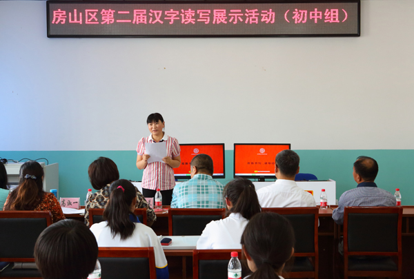 初中组展示活动顺利结束标志着房山区第二届汉字读写展示活动圆满落幕。房山区第二届汉字读写展示活动分小学、初中和高中三个组别,全区各中、小学和职业学校在校内广泛开展汉字读写活动的基础上,有72所学校组成了82支代表队,共410名学生参加区级展示活动。