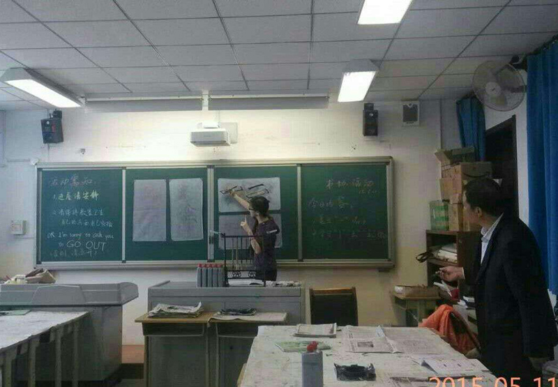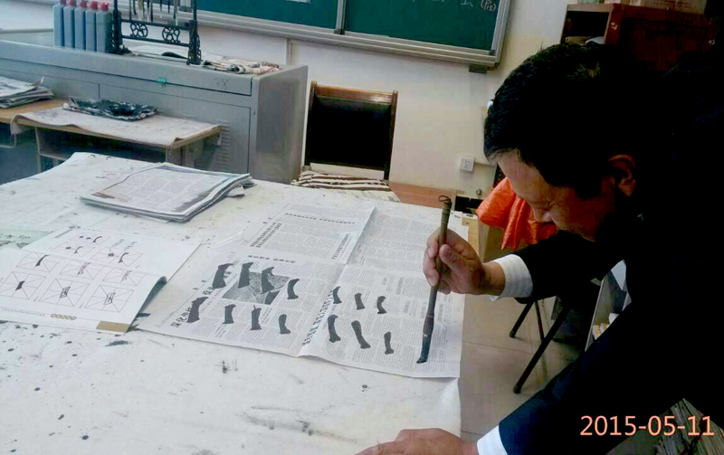 “教师书法协会”已有40余名会员,每周一下午第八节课开展研讨交流和切磋。5月11日下午,没有上课任务的会员来到书法教室聆听该校书法教师张梦初关于笔画的讲解,并进行书法练习。