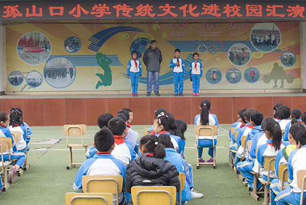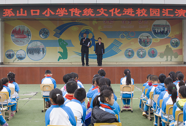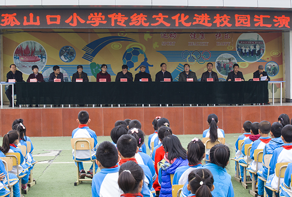 为展示孤山口小学 “春风化雨行动—传统文化进校园”项目成果,2017年3月17日(星期五)孤山口小学举办了“孤山口小学传统文化进校园汇演”。展示活动丰富多彩,朗诵、吟诵、古诗串串烧、古诗新唱等朗诵形式陆续展示,师生同台朗诵原创诗歌,家长学生上台朗诵,更有古诗太极扇表演、古诗韵律操表演等。师生和家长为来宾和到场的家长展示了一场朗诵的饕餮盛宴。