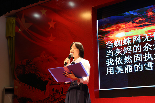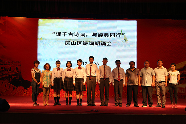 此次活动评委由区教师进修学校任全林、邓长生、张学燕老师担纲。区语委办主任康建兴、房山中学校长吕宝新、房山中学副书记李士宇、房山中学副校长杜林峰及房山中学高一全体学生参加了诗词朗诵会。