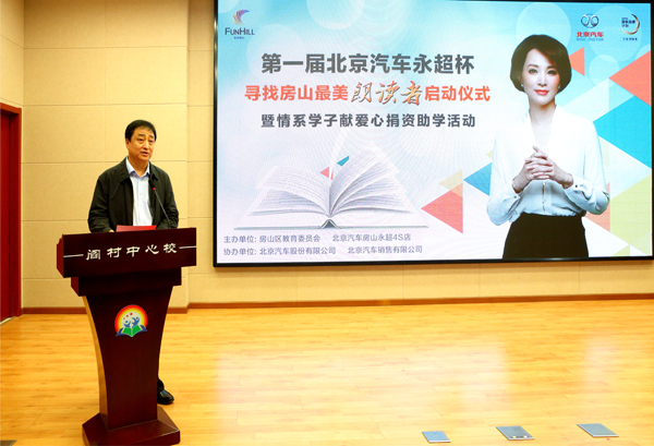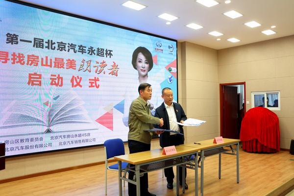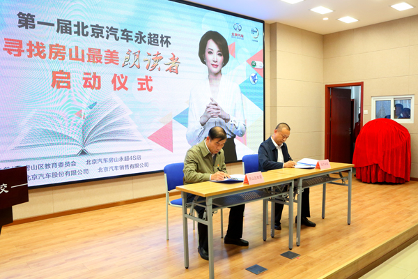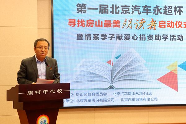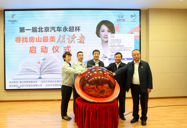 启动会由区教委武玉章主持,区教委小教科于春梅解读了“寻找房山最美朗读者”活动方案,区语委办主任李占全与北京汽车房山永超4s店王永超经理签订了合作协议;区政协主席张祝华、区教委主任顾成强、北汽股份党委副书记工会主席张国富、北汽销售党委副书记刘煦、北京汽车房山永超4s店王永超经理一同按下了启动仪式键,“寻找房山最美朗读者”活动正式启动。房山区教师语言艺术社团教师与学生代表现场进行了朗诵表演。区政协主席张祝华、区教委主任顾成强、北汽股份党委副书记工会主席张国富为活动致辞并讲话。房山区48所小学领导,阎村中心小学部分家长、学生参加了启动仪式。