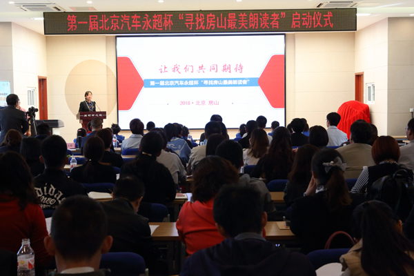 为弘扬汉语语言文化,激发学生阅读兴趣,培养学生阅读习惯,提升学生阅读素养,展示全区“大阅读”活动成果,房山区教育委员会与北汽集团联合开展“寻找房山最美朗读者”活动。10月10日在阎村中心小学多功能厅举办了房山区第一届“寻找房山最美朗读者”启动会。