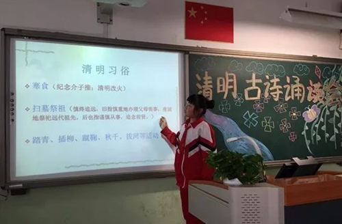 学校通过主题班会、古诗朗诵、讲故事等形式让学生了解有关清明节的发展、故事和诗歌楹联,感受清明节的民俗文化,从而激发学生热爱祖国优秀传统文化的情感。