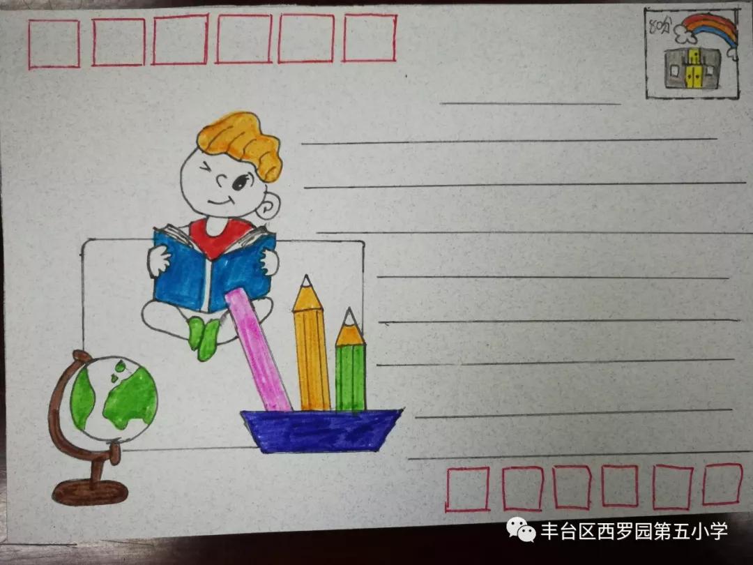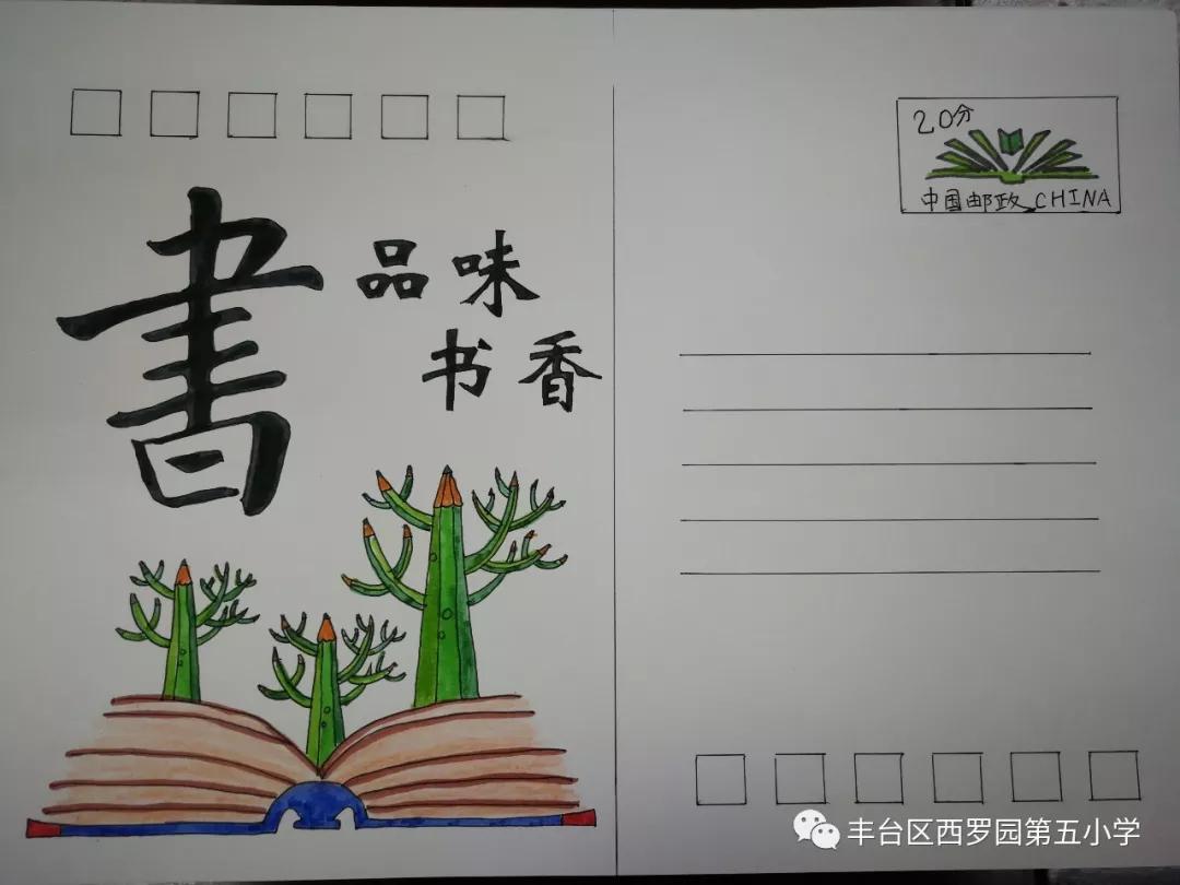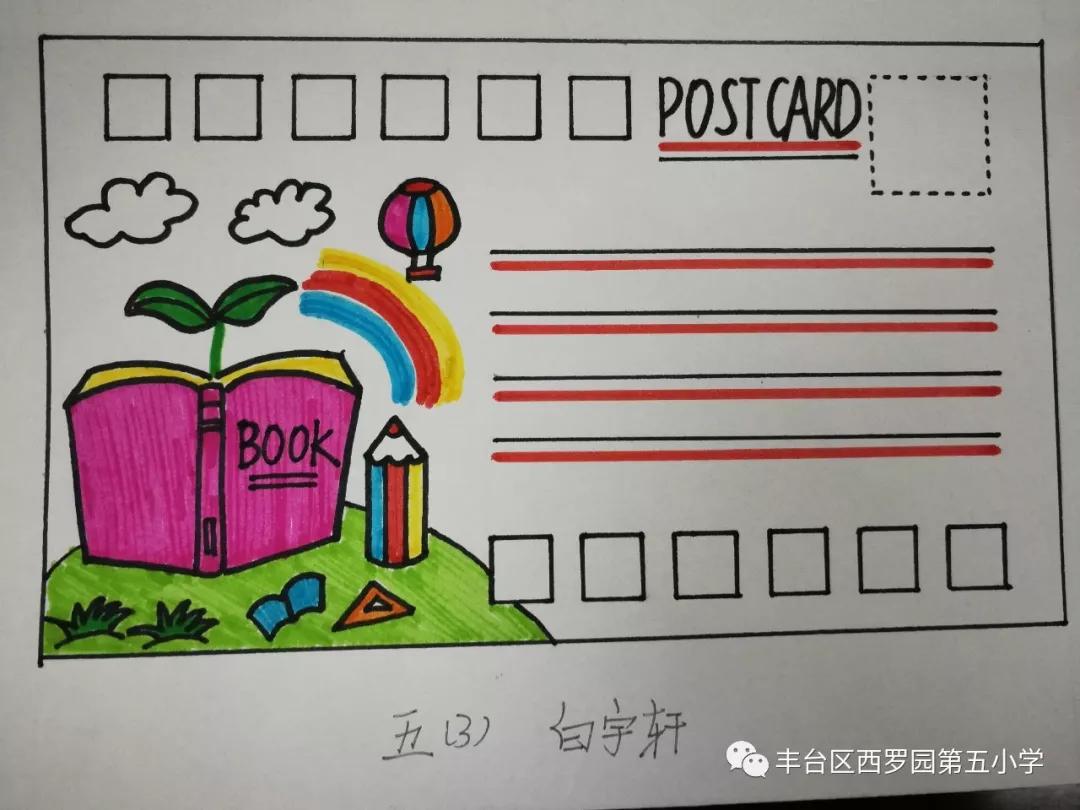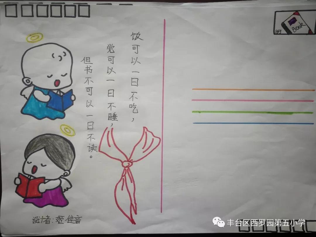 伴随着西罗园五小“红领巾”主题驿站的成立,在世界图书日到来之际,为向全体学生普及邮政文化、同时将爱读书、读好书成为队员们的好习惯,学校少先队大队号召队员们绘制“阅读—书籍”主题明信片。