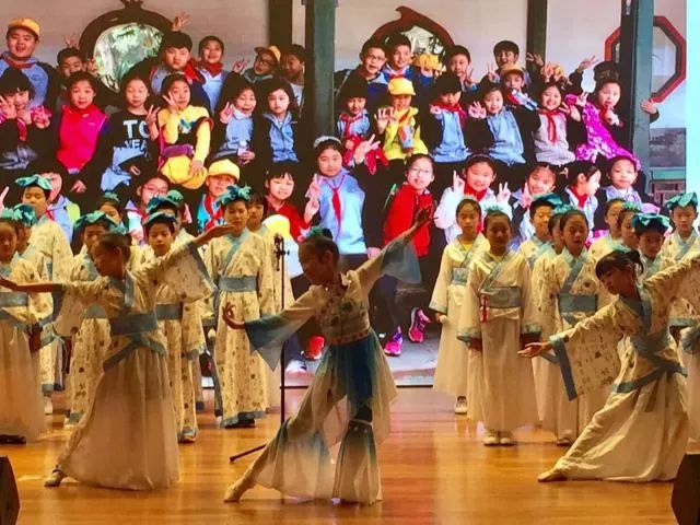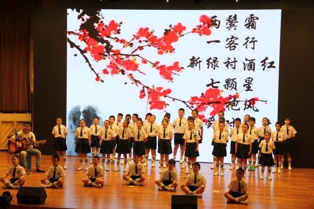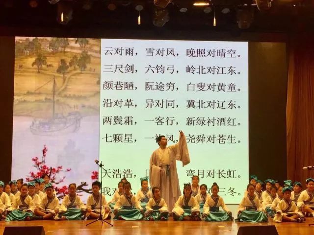 “两岸晓烟杨柳绿,一园春雨杏花红……”伴随着一阵阵悦耳的歌声,孩子们依次身着特色服装,精神饱满地登台展现自己的风采。在演出过程中,每个班级都先用《声律启蒙》向经典致敬,再围绕不同的主题,展示诗风词韵中吟不尽的民族情怀、唱不完的千年思绪。