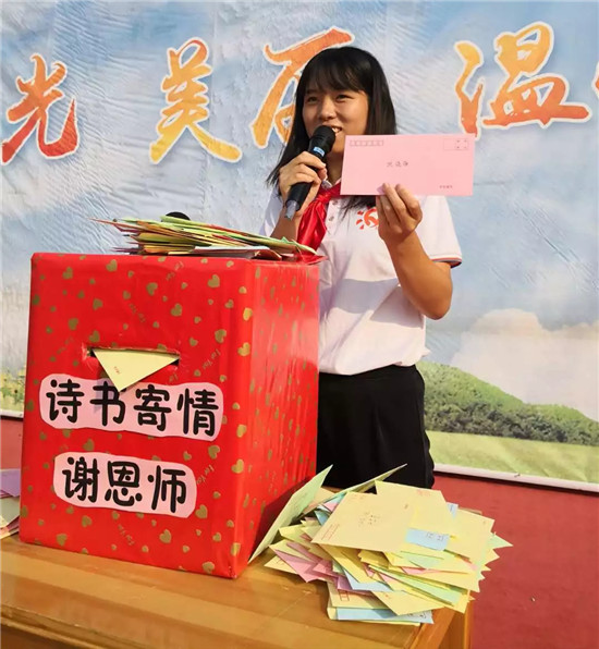 升旗仪式上,知心姐姐在全校同学信件中,随机抽取幸运的同学阅读书信,并将书信亲手送给自己的老师。一句句暖心的话语,让我们感受到孩子对老师满满的爱。