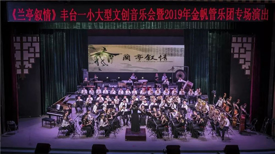 丰台一小聘请台湾管乐协会副理事长林俊吉先生,带领其创作团队,依据学校管乐团学生的演奏水平,创作改编了一首大型交响乐曲《兰亭集序》。全曲演奏时长近20分钟,以古筝、琵琶、钢琴及交响管乐团的综合表演形式,运用丰富的音乐语言和音响效果,诠释了书法作品《兰亭序》的丰富内涵。