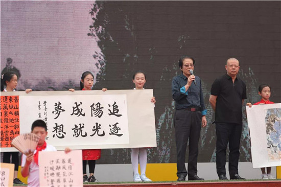 为庆祝中华人民共和国成立70周年,杨广馨、崔泽培两位艺术家与向阳花书画社团的老师和同学们共同创作了两幅书画长卷。文天祥的《过零丁洋》、朱熹的《春日》、李白的《关山月》、王维的《使至塞上》以及青山绿水映衬下的紫藤、向阳花、荷花、鸭子、燕子……孩子们寄情水墨,感受诗人的爱国情怀,体会祖国的壮美山河。