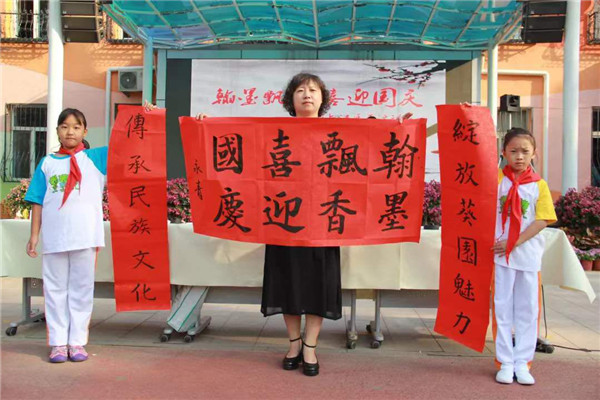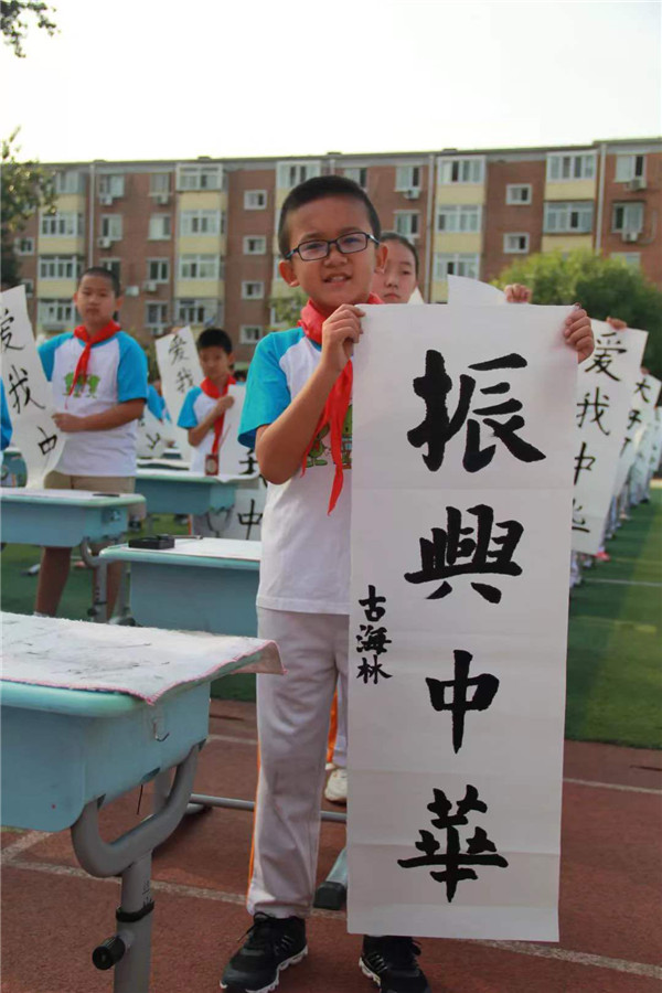 金风送爽秋日到,葵园秋日胜春朝!2019年9月20日,在举国上下同庆祖国第70个华诞之际,我校五、六年级师生汇聚一堂,举行了主题为“翰墨飘香、喜迎国庆”的书法展示活动,以书法表演的方式为祖国送上深深的祝福。