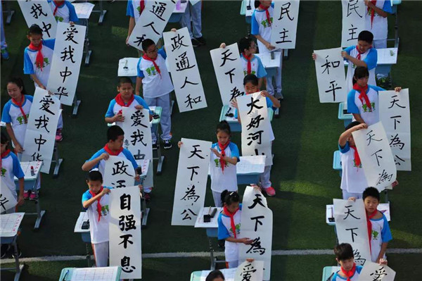 笔墨言志,丹青传情!表演活动中,学生以社会主义核心价值观的内容为主旋律,用楷书的字体来呈现出一幅幅作品。在老师的带领下,同学们专心致志,运笔流畅潇洒流落,顿笔精准法度严谨。一方小字,有的写得雄劲有力,有的写得清秀飘逸!师生们创作出一幅幅精美的书法作品。书法冯老师也跻身其中,走笔游龙,师生共伏案,撷得彩云写华章!