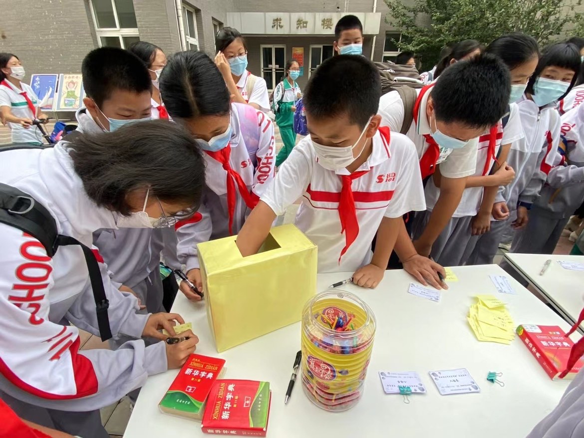 9月14日清晨,当天边映出第一缕橙红的光,十三班的考官们、摄影师等人员早早到岗,准备迎接来参加活动的同学们。在副考官热情洋溢的招呼下,各年级同学争先恐后地来到抽屉箱前,认真思考、仔细斟酌,用手中的笔写出答案。考官们根据同学们的答案严谨审阅,遇到疑难处便查阅字典,小到一横一竖,大到每个字的间架结构反复推敲,亲自示范,用实际行动展现“说普通话,写规范字”的倡导。现场活动格外火爆,在这短暂的时光中,“上地汉字王”的活动虽已结束,但我们说普通话,写规范字的脚步却永不停止。