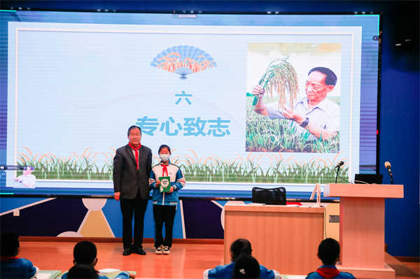 蒋老师还分享了和袁隆平院士一样为农业科学研究做出重大贡献的科学家和“普通人”的故事,结合一些基本农业科学知识,帮助同学们加深对《袁隆平传》的阅读理解,如杂交水稻的授粉原理等等。最后,蒋老师提出希望同学们能够好学勤思、培养广泛的兴趣、做事专心致志,像袁隆平院士那样做一个始终褒有好奇心,富有创新精神,不断努力实现自己的梦想。