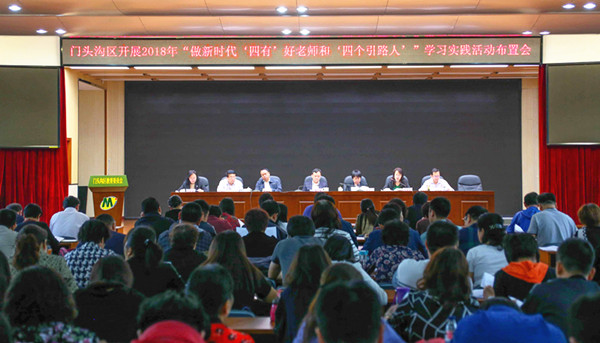 5月21日,门头沟区教育系统开展2018年“做新时代‘四有’好老师和四个引路人”学习实践活动布置会。教育两委一室领导、各基层单位党政负责人、人事干部共计150余人参加。会议由教工委副书记、教委主任陈江锋主持。