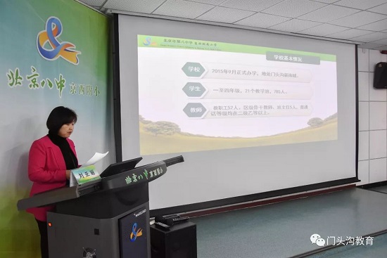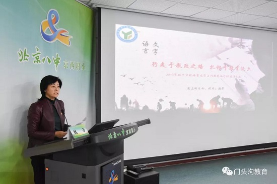 大峪中学分校校长魏芳做主题为《语言文字,行走于教改之路 ,扎根于教育沃土》的汇报。作为北京市唯一的一所诗歌特色学校,学校不仅以诗歌为载体提升师生文学素养,更是在语言文字工作方面提出“四纳入一渗透”的