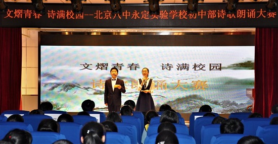4月3日,初中部师生欢聚一堂,举办了“文熠青春诗满校园”北京八中永定实验学校诗歌朗诵大赛。本次大赛的评委老师由北京八中永定实验学校李纪洲校长、杨双武副校长、彭国柱老师、李广川老师、欧阳超老师共同担任,即时排名,现场角逐。