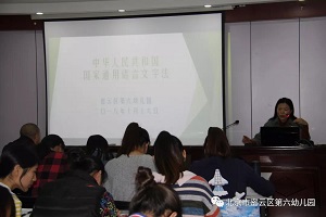 密云区第六幼儿园积极落实学校语言文字工作规范化达标建设工作,10月16日开展全员学习《中华人民共和国国家通用语言文字法》的活动。
