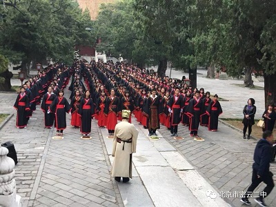 最盛大的环节就是下面的谢师礼。上百名学子们换上服装,在广场上站好,根据主持人的指导,正衣冠、四拜孔子、教师上台宣誓、学生三拜老师、学生代表送敬师礼、老师还礼、学生宣誓,礼成!庄重而又严肃的敬师礼,在这清净的渲染下愈发使人充满了敬意,感恩之意。感谢那些为我们努力付出的教师们,你们辛苦了!