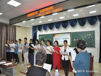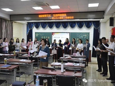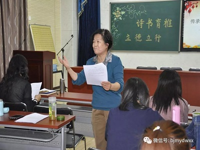 学校邀请北京市语文现代化研究会副秘书长、经典诵读推广人李文华教师指导全体教师提升朗诵水平。活动中,李老师以《我骄傲,我是一名教师》和各年级语文课文为例,指导学校教师如何在朗诵中运用情感、停连、重音、节奏等技巧,从而提升朗诵水平。全体教职工受益匪浅,深受启迪。