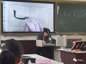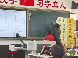 两位专家首先走进柴秀全老师的书法课堂。课堂中,柴老师由古诗《咏鹅》引入,创设情境让学生认识竖弯钩,带领学生不断尝试、体验,在实践中总结习字的方法。