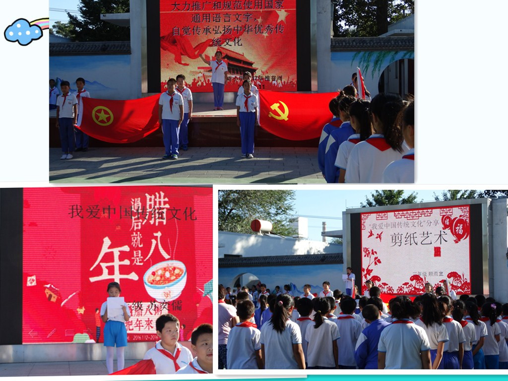 1.升旗仪式上,学生进行题为《由勿忘国耻到全民推普》的演讲,倡议全校学生坚持课堂内与老师、同学的交流使用普通话,并能到达准确流利。课后与老师同学交流使用普通话,构成良好的语言交际环境。