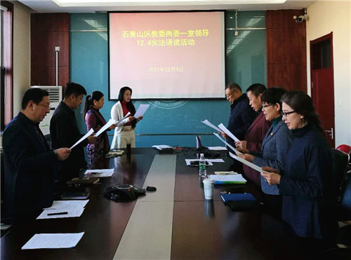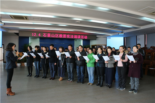 2017年12月4日是第四个国家宪法日,也是第十七个全国法制宣传日。根据教育部及市教委精神,为进一步普及宪法知识、增强宪法意识、弘扬宪法精神,石景山区教委两委一室领导、教委机关全体及区属中小学全部开展了宪法部分章节诵读活动。此次诵读活动,诵出了感情,诵出了对祖国的热爱,既是一次法制宣传活动,又是一次爱国主义教育。