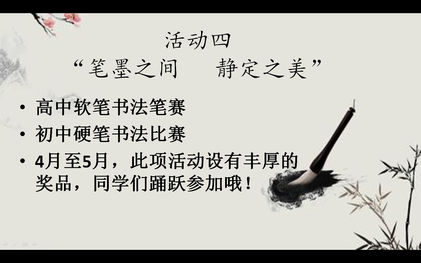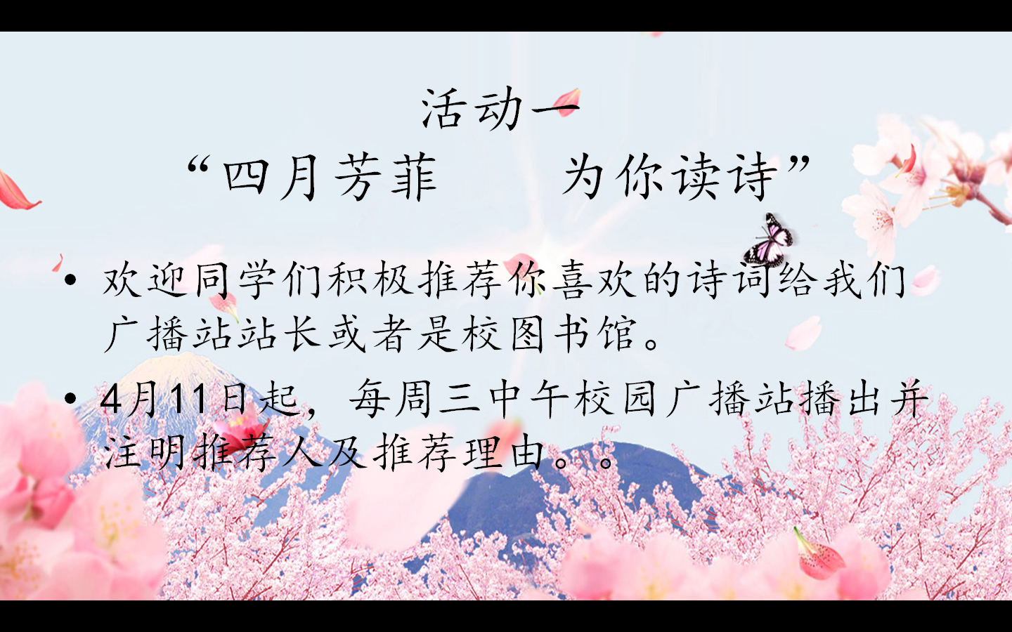 在四月芳菲的时节,首都师范大学附属苹果园中学借助校园清明诗会拉开了读书活动的序幕。欢迎各位师生积极参与读书活动,让读书成为一种习惯。正如冯岩校长所讲:“手捧书籍,就是手捧希望;开卷读书,就是打开窗户。书虽然不能帮你解决所有问题,却能给你一个更好的视角。读书到了最后,是为了让我们更宽容地去理解这个世界有多复杂。读书,只为能遇见更好的自己!”