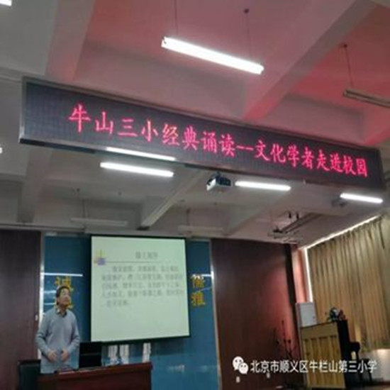 牛山三小积极响应中华古诗文经典诵读工程全国组委会提出的“读千古美文,做少年君子”的倡议,在学校开展中华古诗文经典诵读活动,学校的诵读内容三个方面:一是语文教材;二是课标推荐的小学必背古诗;三是学校自选的内容。为了诵读活动有效实施,学校专门开设了诵读课程,并聘请首都师范大学李文华教授为我校师生进行诵读指导。李老师说:经典诵读简单、易行,有益、有效,没成本。还提出:练体力,练毅力;练声音,练胆量;练出精气神,自信走天下的练习目标。