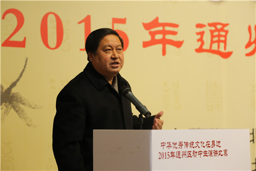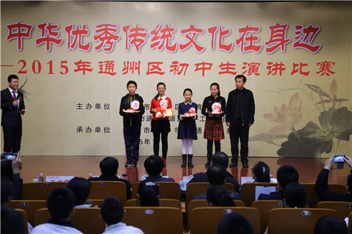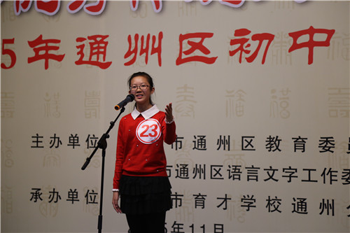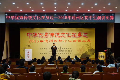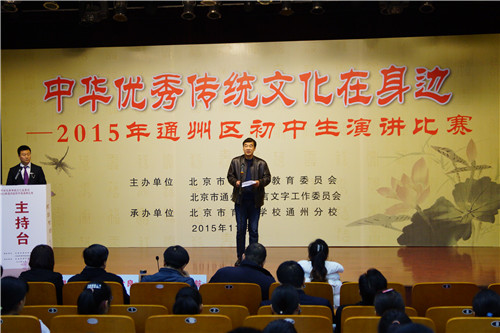 为贯彻落实《北京市中小学语文学科教学改进意见》,推动开放性语文学习活动,切实加强初中生语文素养,提升初中生语言表达能力,根据《北京市中小学生辩论俱乐部2015年工作要点》及相关工作安排, 2015年11月14日,通州区语委在北京市育才学校通州分校举办了以“中华优秀传统文化在身边”为主题的初中生演讲比赛决赛活动。
