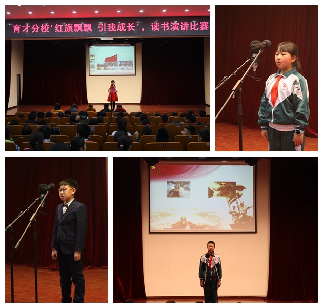 活动中,各班学生在教师的组织和带领下,以《红旗飘飘 引我成长》读本为基础,开展了读书征文撰写、主题演讲等系列读书活动。2018年3月19日,学校在报告厅举办了“红旗飘飘引我成长”主题演讲校级决赛。12名参赛选手的演讲主题鲜明,内容真实感人,讲稿结构严谨,文字简洁流畅,演讲语音规范,吐字清晰,语言技巧处理得当,富有艺术感染力,诠释了育才少年学党史、知党情、感党恩、听党话、跟党走的信念和决心。
